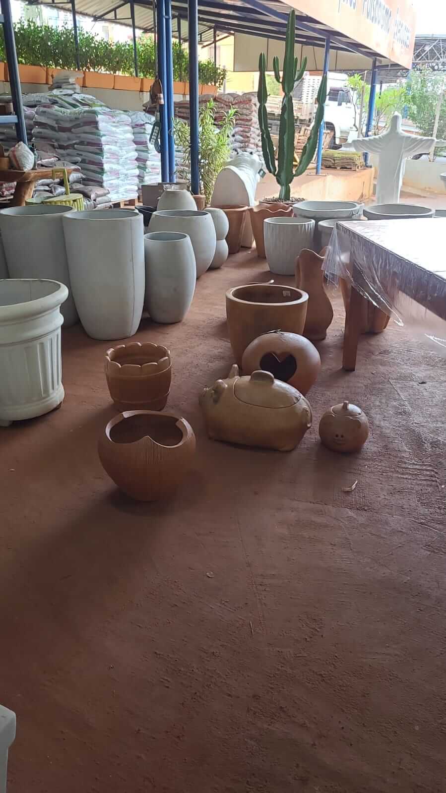 Plantas, Vasos, Estatuetas, Artefatos de concreto, Terra vegetal, Terra com condicionadores, Pedras e casca de Pinos.